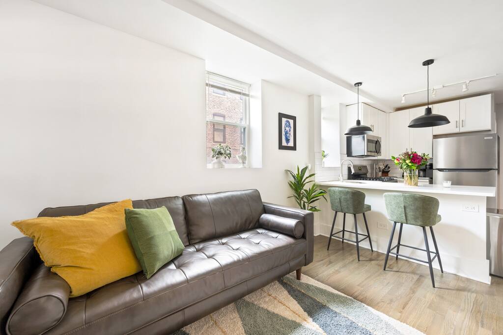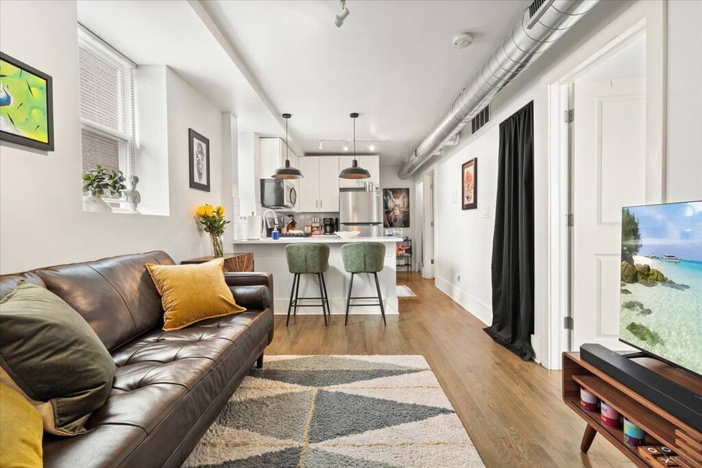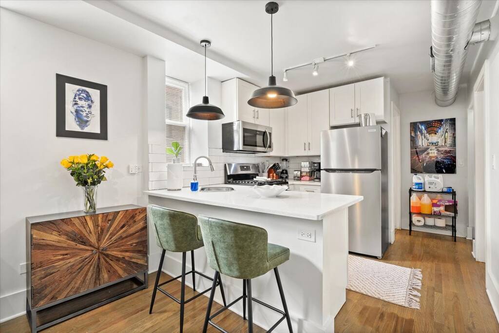 The unit is within a multi-family property with Chicago locals in adjacent units. A stocked kitchen, 2 separate bedrooms, 1 bathroom, a living room space.