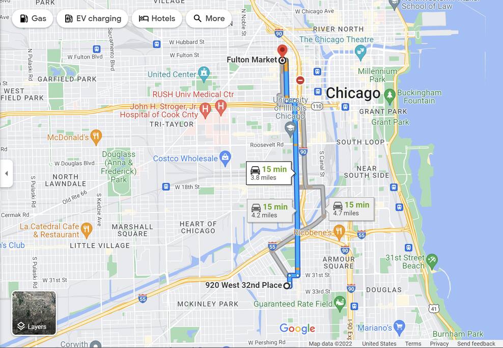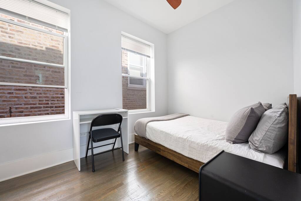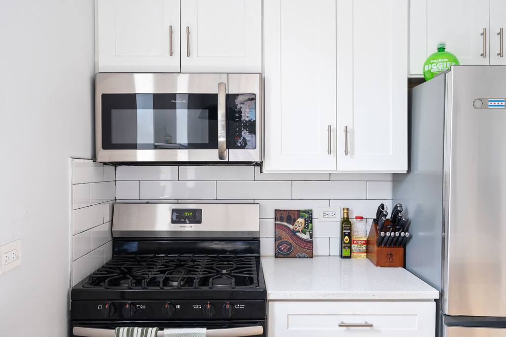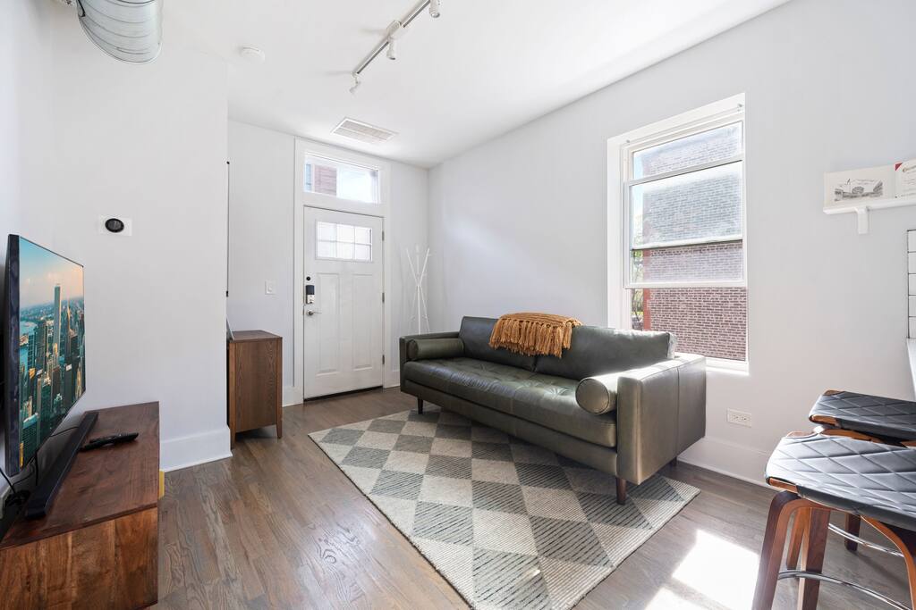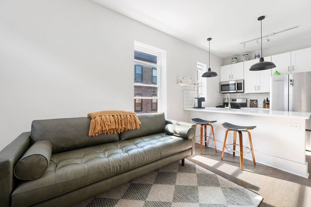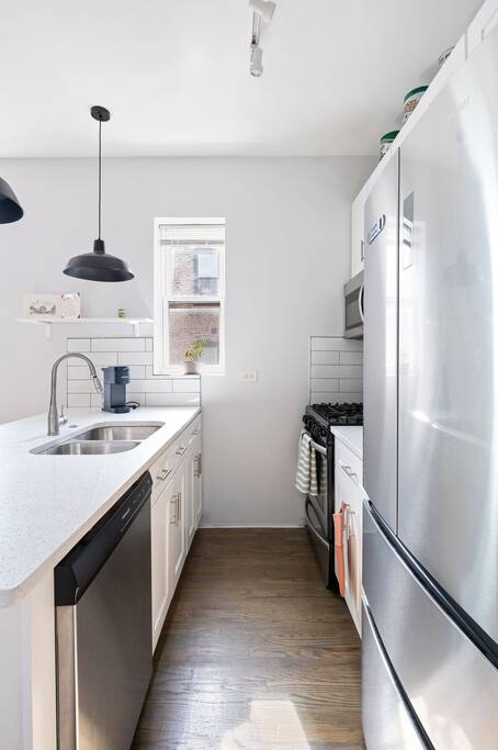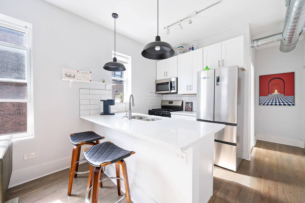 -Inquire -600 sq.ft apartment / 2nd floor / -Free parking pad in rear / free street parking -Commute to Downtown: 15min (drive) / 28min (transit/train) / 22min(bike) -Walk score 93! Bike Score 92! Near Trains to Downtown!! -Gated access w/ Building video and security alarm system and noise monitoring equipment. -Kitchen is stocked w/ cookware, utensils, etc. -Washer and Dryer and Dishwasher in unit (free) -Rideshare(Uber/Lyft) / Bikeshares(Divvy) are bountiful -Safe, working class neighborhood!